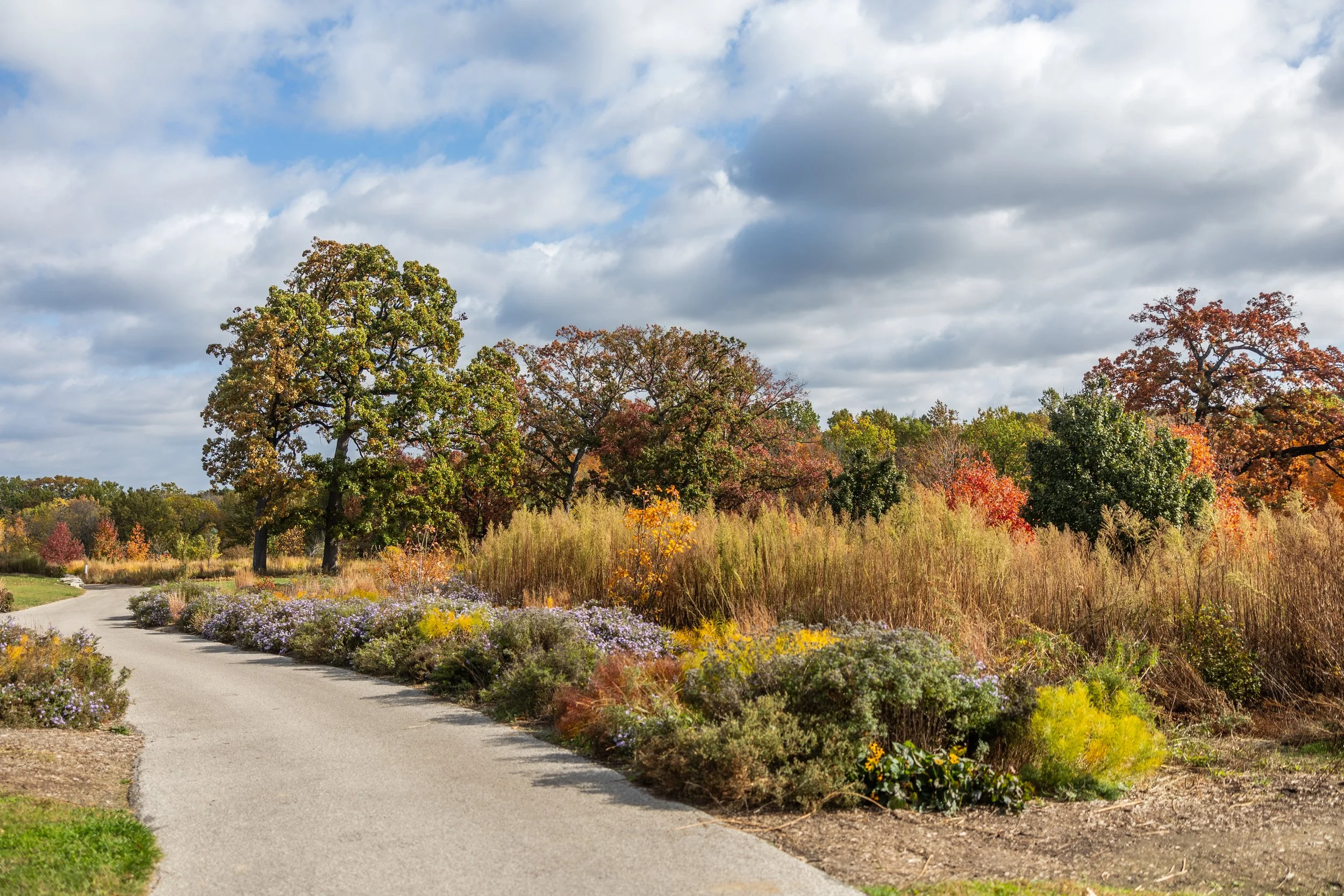 Colorful foliage lines a paved pathway through the Nature Playscape as full-leaf autumn trees fill the background underneath a blue overcast sky.